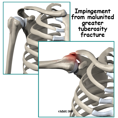 The most detrimental problem with malunion occurs in relation to a joint. If an avulsion fracture of the greater tuberosity heals malunited it may impinge on the acromion process when the arm is lifted to the side. This situation can be treated with surgery to recess the tuberosity back into position and fix it. If the fracture involves the joint surface itself malunion may mean that the joint surface is irregular. This predisposes the joint to early post-traumatic arthritis. If the malunited fracture involves the glenoid it may be possible to operate to move the fragment back into position and make the joint surface smoother. Due to problems with the blood supply this may not be advisable in the case of malunited fractures of the head of the humerus.