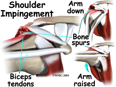 Biceps ruptures generally occur in people who are between 40 and 60 years old. People in this age group who've had shoulder problems for a long time are at most risk. Often the biceps ruptures after a long history of shoulder pain from tendonitis (inflammation of hte tendon) or problems with shoulder impingement. Shoulder impingement is a condition where the soft tissues between the ball of the upper arm and the top of the shoulder blade (acromion) get squeezed with arm motion.