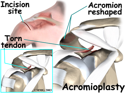The surgeon begins by making an incision across the top of the shoulder. The shoulder muscles are separated to expose the top of the humerus. Bone spurs are removed, along with part of the acromion. The surgeon then smooths the rough ends of the bone.