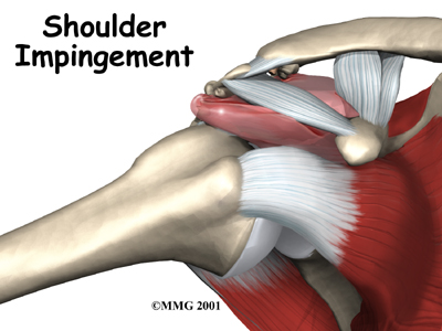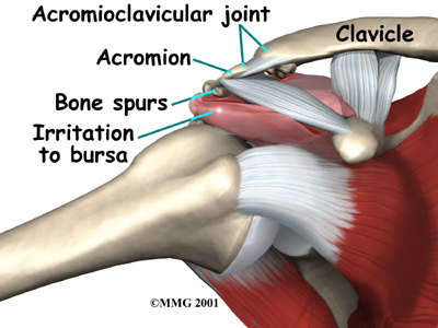 Related Document: Ari Levine PT, PC's Guide to Shoulder Anatomy Shoulder Anatomy Introduction CausesWhy do I have problems with shoulder impingement? Usually, there is enough room between the acromion and the rotator cuff so that the tendons slide easily underneath the acromion as the arm is raised. But each time you raise your arm, there is a bit of rubbing or pinching on the tendons and the bursa. This rubbing or pinching action is called impingement. Impingement occurs to some degree in everyone's shoulder. Day-to-day activities that involve using the arm above shoulder level cause some impingement. Usually it doesn't lead to any prolonged pain. But having poor posture, continuously working with the arms raised overhead, repeated throwing activities, or other repetitive actions of the shoulder can cause impingement to become a problem. Impingement becomes a problem when it causes irritation or damage to the rotator cuff tendons. Raising the arm tends to force the humerus against the edge of the acromion. With overuse, this can cause irritation and swelling of the bursa. If any other condition decreases the amount of space between the acromion and the rotator cuff tendons, the impingement may get worse. For example, poor posture that involves an increased forward curve in the upper back (kyphosis) and rolling inward of the shoulders affects the alignment of the humerus under the acromion. This alters the biomechanics of the shoulder (the ability of the shoulder to move freely and effeciently in space) which means even daily activity such as reaching increases the contact under the acromion. Bone spurs can reduce the space available for the bursa and tendons to move under the acromion. Bone spurs are bony points. They are commonly caused by wear and tear of the joint between the collarbone and the scapula, called the acromioclavicular (AC) joint. The AC joint is directly above the bursa and rotator cuff tendons.
