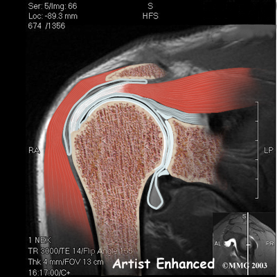 An arthrogram may also be used to detect rotator cuff tears. The arthrogram is an older test than the MRI, but it is still widely used. It involves injecting dye into the shoulder joint and then taking several X-rays. If the dye leaks out of the shoulder joint, it suggests that there is a tear in the rotator cuff tendons. In some cases, it is unclear whether the pain is coming from the shoulder or a pinched nerve in the neck. An injection of a local anesthetic (such as lidocaine) into the bursa can confirm that the pain is in fact coming from the shoulder. If the pain goes away immediately after the injection, then the bursa is the most likely source of the pain. Pain from a pinched nerve in the neck would almost certainly not go away after an injection into the shoulder. If the pain doesn't go away, an injection of cortisone into the joint may help. Cortisone is a strong medication that decreases inflammation and reduces pain. Cortisone's effects are temporary, but it can give very effective relief for up to several months. SurgeryIf you are still having problems after trying nonsurgical treatments, your doctor may recommend surgery. Subacromial Decompression The goal of surgery is to increase the space between the acromion and the rotator cuff tendons. Taking pressure off the tissues under the acromion is called subacromial decompression. The surgeon must first remove any bone spurs under the acromion that are rubbing on the rotator cuff tendons and the bursa. Usually the surgeon also removes a small part of the acromion to give the tendons even more space. In patients who have a downward tilt of the acromion, more of the bone may need to be removed. Surgically cutting and shaping the acromion is called acromioplasty. It gives the surgeon another step to get pressure off (decompress) the tissues between the humerus and the acromion. Resection Arthroplasty Impingement may not be the only problem in an aging or overused shoulder. It is very common to also see degeneration from arthritis in the AC joint. If there is reason to believe that the AC joint is arthritic, the end of the clavicle may be removed during impingement surgery. This procedure is called a resection arthroplasty. The most common procedure for AC joint osteoarthritis is resection arthroplasty. A resection arthroplasty involves removing a small portion of the end of the clavicle. This leaves a space between the acromion (the piece of the scapula that meets your shoulder) and the cut end of the clavicle, where the joint used to be. Your surgeon will take care not to remove too much of the end of the clavicle to prevent any damage to the ligaments holding the joint together. Usually only a small portion is removed, less than one cm (about three-eighths of an inch). As your body heals, the joint is replaced by scar tissue. Remember, the AC joint doesn't move much, but it does need to be flexible. The scar tissue allows movement but stops the bone ends from rubbing together. This procedure can be done in two ways. Today, it is more common to do this procedure using the arthroscope. An arthroscope is a slender tool with a tiny TV camera on the end. It lets the surgeon work in the joint through a very small incision. This may result in less damage to the normal tissues surrounding the joint, leading to faster healing and recovery. Related Document: Ari Levine PT, PC's Guide to Osteoarthritis of the Acromioclavicular Joint Closed Procedure Using Arthroscope An arthroscope is a special type instrument designed to look into a joint, or other space, inside the body. The arthroscope itself is a slender metal tube smaller than a pencil. Inside the metal tube are special strands of glass called fiberoptics. These small strands of glass form a lens that allows one to look into the tube on one end and see what is on the other side - inside the space. This is similar to a microscope or telescope. In the early days of arthroscopy, the surgeon actually looked into one end of the tube. Today, the arthroscope is attached to a small TV camera. The surgeon can watch the TV screen while the arthroscope is moved around in the joint. Using the ability to see inside the joint, the surgeon can then place other instruments into the joint and perform surgery while watching what is happening on the TV screen. The arthroscope lets the surgeon work in the joint through a very small incision. This may result in less damage to the normal tissues surrounding the joint, leading to faster healing and recovery. If your surgery is done with the arthroscope, you may be able to go home the same day. To perform the acromioplasty using the arthroscope, several small incisions are made to insert the arthroscope and special instruments needed to complete the procedure. These incisions are small, usually about one-quarter inch long. It may be necessary to make three or four incisions around the shoulder to allow the arthroscope to be moved to different locations to see different areas of the shoulder.