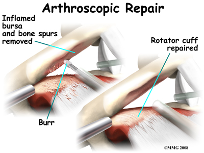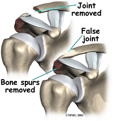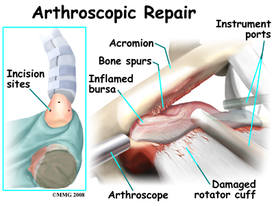 There are many small instruments that have been specially designed to perform surgery in the joint. Some of these instruments are used to remove torn and degenerative tissue. Some of these instruments nibble away bits of tissue and then vacuum them up from out of the joint. Others are designed to burr away bone tissue and vacuum it out of the joint. These instruments are used to remove any bone spurs that are rubbing on the tendons of the shoulder and smooth the under surface of the acromion and AC joint. Open Procedure In other cases, an open incision is made to allow removal of the bone. Usually an incision about three or four inches long is made over the top of the shoulder. The surgeon removes any bone spurs and a part of the acromion. The surgeon then smooths the rough ends of the bone. If necessary, the surgeon will do a resection arthroplasty on the AC joint. If you have open surgery, you may need to spend a night or two in the hospital.