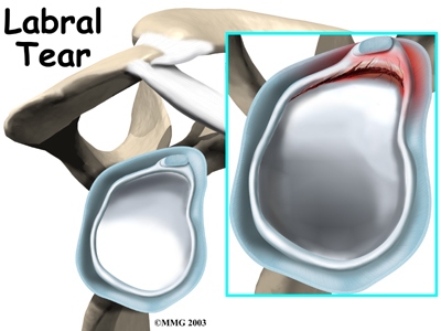 Labral tears are often caused by a direct injury to the shoulder, such as falling on an outstretched hand. The labrum can also become torn from the wear and tear of activity, a condition called overuse. An injured labrum can lead to shoulder instability. The extra motion of the humerus within the socket causes additional damage to the labrum. An extremely unstable shoulder may slip or dislocate. This can also cause the labrum to tear.