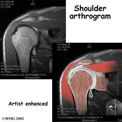 An MRI scan is a special imaging test that uses magnetic waves to show the tissues of the shoulder in slices.