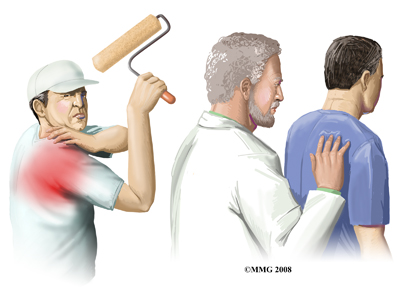 Our physical therapist will ask questions about your activity, possible traumatic injury, and the symptoms you are having. Physical examination usually includes evaluating range of motion, strength testing, checking reflexes and assessing sensation. During this examination we will appy pressure over various areas of the shoulder to see where it may be painful.