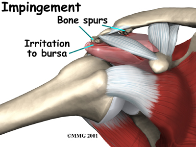 A bursa is located between the acromion and the rotator cuff tendons. A bursa is a lubricated sac of tissue that cuts down on the friction between two moving parts. Bursae are located all over the body where tissues must rub against each other. In this case, the bursa protects the acromion and the rotator cuff from grinding against each other.