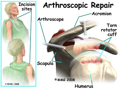 An arthroscope is a special type instrument designed to look into a joint, or other space, inside the body. The arthroscope itself is a slender metal tube smaller than a pencil. Inside the metal tube are special strands of glass called fiberoptics. These small strands of glass form a lens that allows one to look into the tube on one end and see what is on the other side - inside the space. This is similar to a microscope or telescope. In the early days of arthroscopy, the surgeon actually looked into one end of the tube. Today, the arthroscope is attached to a small TV camera. The surgeon can watch the TV screen while the arthroscope is moved around in the joint. Using the ability to see inside the joint, the surgeon can then place other instruments into the joint and perform surgery while watching what is happening on the TV screen. The arthroscope lets the surgeon work in the joint through a very small incision. This may result in less damage to the normal tissues surrounding the joint, leading to faster healing and recovery. If your surgery is done with the arthroscope, you may be able to go home the same day. ![]() To perform the rotator cuff repair using the arthroscope, several small incisions are made to insert the arthroscope and special instruments needed to complete the procedure. These incisions are small, usually about one-quarter inch long. It may be necessary to make three or four incisions around the shoulder to allow the arthroscope to be moved to different locations to see different areas of the shoulder.
