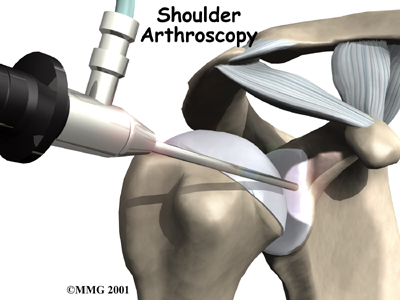 To perform the Bankart type repair using the arthroscope, several small incisions are made to insert the arthroscope and special instruments needed to complete the procedure. These incisions are small, usually about one-quarter inch long. It may be necessary to make three or four incisions around the shoulder to allow the arthroscope to be moved to different locations to see different areas of the shoulder. A small plastic, or metal, tube is inserted into the shoulder and connected with sterile plastic tubing to a special pump. Another small tube allows the fluid to be removed from the joint. This pump continuously fills the shoulder joint with sterile saline (salt water) fluid. This constant flow of fluid through the joint inflates the joint and washes any blood and debris from the joint as the surgery is performed. There are many small instruments that have been specially designed to perform surgery in the joint. Some of these instruments are used to remove torn and degenerative tissue. Some of these instruments nibble away bits of tissue and then vacuum them up from out of the joint. Others are designed to burr away bone tissue and vacuum it out of the joint. These instruments are used to remove any bone spurs that are rubbing on the tendons of the shoulder and smooth the under surface of the acromion and AC joint. Once any degenerative tissue and bone spurs are removed, the torn ligaments that stabilize the shoulder are reattached to the bone around the socket of the shoulder, the glenoid. Special devices have been designed to reattach these ligaments. These devices are called suture anchors.