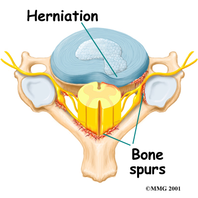 Heavy, repetitive bending, twisting, and lifting can place extra pressure on the shock-absorbing nucleus of the disc. A blow to the head and neck can also cause extra pressure on the nucleus. If great enough, this increased pressure can injure the annulus (the tough, outer ring of the disc). If the annulus ruptures, or tears, the material in the nucleus can squeeze out of the disc. This is called a .