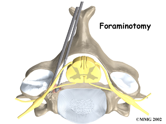 A foraminotomy is done to open the neural foramen and relieve pressure on the spinal nerve root. A may be done because of bone spurs or inflammation.