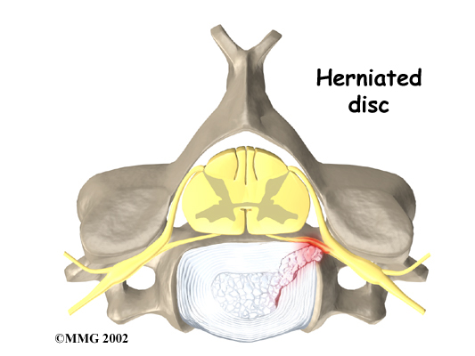 Discectomy is used to alleviate symptoms of a . A disc herniation happens when the nucleus inside the center of the disc pushes through the annulus, the ligaments surrounding the nucleus. The herniated disc material may push outward, causing pain. Numbness or weakness in the arm occurs when the nucleus pushes on the spinal nerve root. Of greater concern is a condition in which the nucleus herniates straight backward into the spinal cord, called a central herniation. Discectomy relieves pressure on the ligaments, nerves, or spinal cord.
