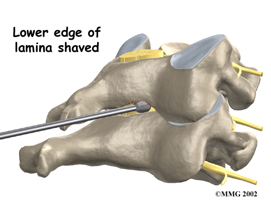 Then the surgeon may use an X-ray to identify the injured disc. A burr is used to , the back part of the ring over the spinal cord. When the disc has jutted straight backward into the spinal cord (central herniation), surgeons may need to completely remove both lamina bones in order to see better and to be able to clear all the pieces of the disc near the spinal cord.