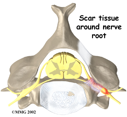 Any surgery that is done near the spinal canal can potentially cause injury to the spinal cord or spinal nerves. Injury can occur from bumping or cutting the nerve tissue with a surgical instrument, from swelling around the nerve, or from the formation of . An injury to these structures can cause muscle weakness and a loss of sensation to the areas supplied by the nerve.