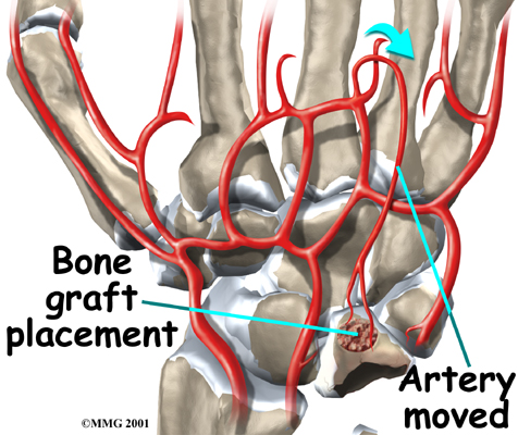 Stage two and stage three Kienbock's disease often require surgery when immobilizing the wrist doesn't help. Attempts to restore the blood flow to the lunate are most likely to be successful when the disease is in the early stages. The procedure to restore blood flow is called . During the operation, the surgeon moves a small section of blood vessels (and also possibly bone) from elsewhere on the wrist. The segment is attached to the deteriorating lunate bone. This is done to restore blood flow to the lunate and halt its deterioration. This is a newer procedure to treat Kienbock's disease and is not always successful. Vascularized bone graft does have the advantage of implanting live bone with a ready made blood supply.If this is successful, the bone heals and the blood supply in the transferred bone fragment grows into the rest of the lunate to restore the blood supply to the entire lunate.