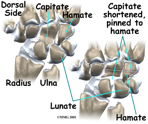 Using an arthroscope, a thin instrument with a TV camera on the end, surgeons are able to operate using a small incision over the lunate. The surgeon cleans the area around the lunate, and then fuses the lunate to the carpal bone next to it. This is called an intercarpal fusion. It’s not a complete or total fusion because not all of the wrist bones are fused together. Bringing an extra blood vessel to revascularize the lunate (described above) is not necessarily a part of the treatment.
