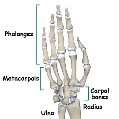 The wrist is not a bone but rather a joint between the two bones of the forearm (the radius and the ulna) and the carpal bones of the wrist. The hand is a collection of small thin bones called the metacarpals and the phalanges. The two rows of carpal bones sit between the bones of the forearm and the metacarpal bones of the hand.
