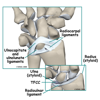 The end of the ulna does not actually contact the carpal bones. There is a disk of fibrous material called the triangular fibrocartilage (or "TFC") in between. The TFC also connects to the radius bone and to the ulnar styloid. This disk together with the ligaments coming from the ulna and the radius are referred to as the TFCC or triangular fibrocartilage complex.