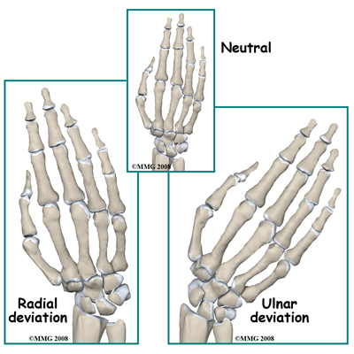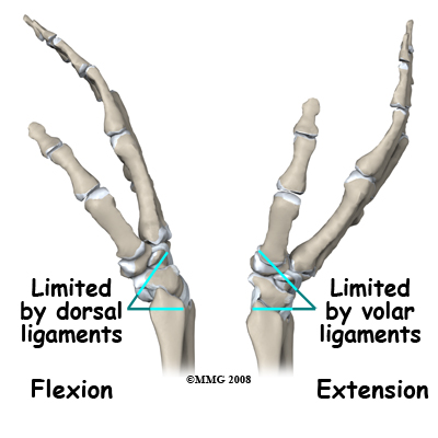 The radio-carpal ligament complex goes from the tip of the radius (called the radial styloid) and spreads out to attach to several bones of the wrist. This ligament is stretched by ulnar deviation (tilting the wrist towards the baby finger side) and also limits the total amount of ulnar deviation available. The equivalent ligament on the ulnar side goes from the ulnar styloid and limits radial deviation (tilting toward the thumb). Aside from ulnar and radial deviation, the other movements at the radiocarpal joint are flexion (bending forward at the wrist) and extension (bending back). The ligaments of the wrist joint that are on the back and front limit these movements. Rotation of the wrist is a combination of these motions.