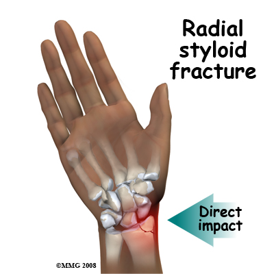 As mentioned above, wrist fractures most commonly occur when you fall on the outstretched hand. The wrist is usually extended (bent back) and pronated (palm down) so that the palm of the hand hits the ground. The force of the fall pushes the wrist into further extension, and often radial deviation. The force causes the bone at the end of the radius to break. In addition, the radial deviation may stress the ulnocarpal ligament, which often pulls off (or avulses) the small ulnar styloid. Unfortunately, the compressive force on the end of the radius is often enough to crush the bone into multiple pieces. This means that the bone fragments are squashed and no longer their normal shape. For this reason, even if the fragments are put back together the healed bone may not return to its normal shape.