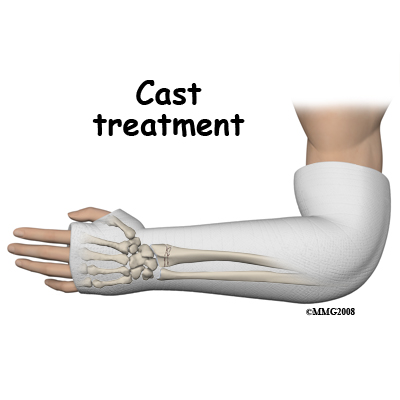 If the fracture is stable and non-displaced then its position does not need to be improved by manipulation, which means moving the bones. These fractures can be treated in a cast. Treating with a cast accomplishes three of the goals of treatment; it improves the pain by splinting the fracture very securely; it protects the fracture; and lastly, it makes it more likely that the fracture fragments will stay in position by preventing movement of the wrist.