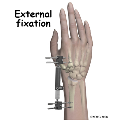Another method of stabilizing the unstable fracture is the external fixator. After the fracture is manipulated into a better position, special threaded pins are drilled into the bone above and below the fracture. These pins are connected by a system of rods. This procedure also requires a fluoroscope and some type of anesthesia, either a general anesthetic or a regional block.