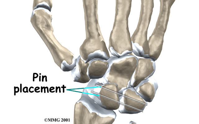 If the ligament damage is recognized within a few weeks after the injury, the surgeon may be able to insert metal pins to hold the bones in place while the ligaments heal. This procedure is called a percutaneous pinning. (Percutaneous means through the skin; an incision is not required.) The surgeon uses a fluoroscope to watch as the pins are placed. The fluoroscope is a type of continuous X-ray machine that shows the X-ray image on a TV screen. In some cases, getting the bones lined up properly is not possible, and an incision must be made to repair the ligaments. The longer the surgery is done after the initial injury, the less likely it is that the bones can be aligned properly. It is also less likely that torn ligaments will heal once scar tissue has developed over the ends. The metal pins are placed to hold the bones still while the ligaments heal. The pins are usually removed four to six weeks after the procedure. Ligament Reconstruction