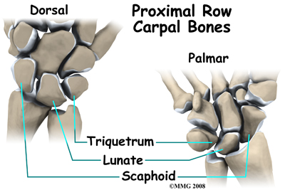 The proximal row of carpal bones connects the two bones of the forearm, the radius and the ulna, to the bones of the hand. On the ulnar side of the wrist, the end of the ulna bone of the forearm moves with two carpal bones, the lunate and the triquetrum.