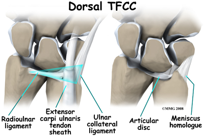 The TFCC stabilizes the wrist at the distal radioulnar joint. It also acts as a focal point for force transmitted across the wrist to the ulnar side. Traumatic injury or a fall onto an outstretched hand is the most common mechanism of injury. The hand is usually in a pronated or palm down position. Tearing or rupture of the TFCC occurs when there is enough force through the ulnar side of the hyperextended wrist to overcome the tensile strength of this structure.