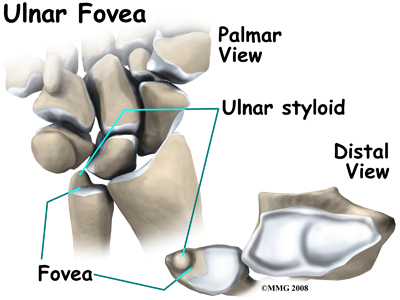 Another important structure to make note of with TFCC injuries is the ulnar fovea. The fovea is a groove that separates the ulnar styloid from the ulnar head. The groove is at the junction of the ulnar bone and wrist. The styloid is a small bump on the edge of the wrist (on the side away from the thumb) where the ulna meets the wrist joint. Later we will talk about the fovea test to diagnose TFCC injuries.
