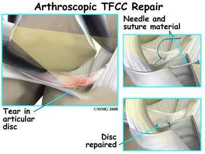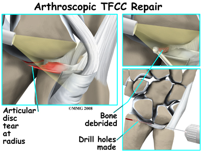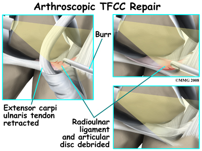 The outside perimeter of the TFCC has a good blood supply. Tears in this area can be repaired. There is no potential for healing when tears occur in the central area where there is no blood supply. In these cases arthroscopic debridement of the damaged tissue is required.