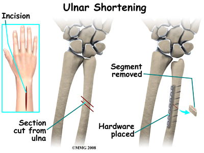 Chronic and degenerative TFCC tears may require a different surgical approach. Debridement is not as successful with this group as it is with acute TFCC injuries. Sometimes it is necessary to shorten the ulnar bone at the wrist to obtain pain relief. There are two procedures used to shorten the ulna and unload the ulnocarpal joint. These are the ulnar (diaphyseal) shortening method and the distal ulnar head shortening osteotomy (Feldon wafer method). If lunate-triquetrum instability is present, ulnar shortening can be done to tighten the ulnocarpal ligaments and decrease the motion between the lunate and triquetrum.